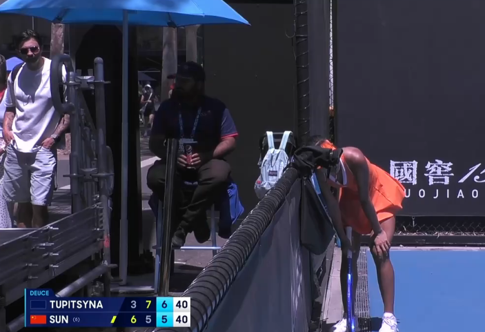 孙心然有些身体不适,多次弯腰休息。第二盘的第九局比赛。孙心然先得1分,但是图皮岑娜随后连续得分保发成功,5比4反超孙心然。